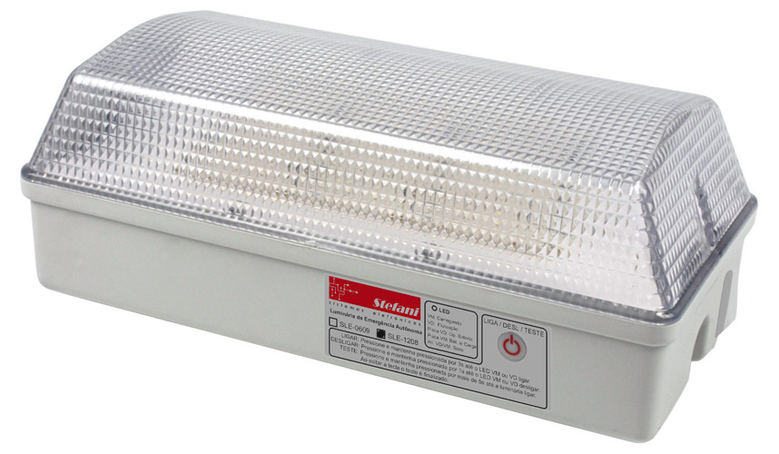 A luminária de Emergência Autônoma SLE-1208 com proteção IP67 é fabricada nas versões 9W, 13,5W e 18W. Indicada principalmente para ambientes com alto índice de humidade ou poeira. Possui alto fluxo luminoso, podendo ser instalada tanto em paredes quanto em forros ou estruturas metálicas. Possui carregador inteligente CC/CV e controle digital de carga e descarga, que em conjunto com o exclusivo sistema de AUTOTESTE proporcionam um significativo aumento da vida útil da bateria, reduzindo os custos posteriores com a manutenção do sistema.